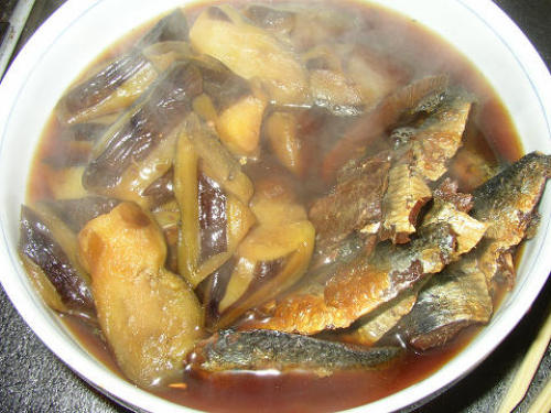 茄子と鰊の煮つけ。鰊は身欠き鰊を使っています。一番簡単なのは味付け煮つけの身欠きを使うことです。ほっこりする味です。