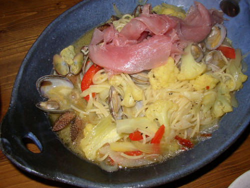 ボンゴレビアンコ。玉ねぎ、パプリカ、カリフラワーを使っています。トッピングに生ハム。このソースが美味いので、残ったら綺麗に濾して、翌日フランスパンを浸けて頂きました。ボロネーゼのソースが残ったら翌日オムレツのソースに使います。