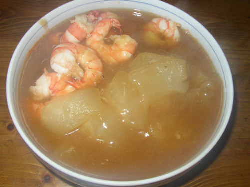 海老と冬瓜の煮つけ。一番オーソドックスな食べ物ですね。なかなか有頭の海老が手に入らないので苦労しました。