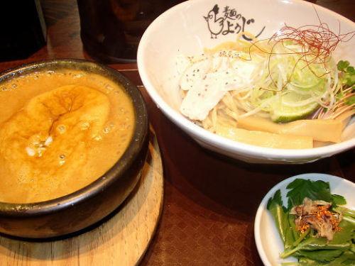 難波の「麺のようじ」、泥つけ麺です。昼は難波まで出てラーメンを食べました。昼時間を大幅に外れていたので、待たずに入店。初めてだったのですが「泥つけ麺」を注文。メニューがとても美味しく見えたのですから。しばし待って石の器に入って出てきた、グツグツ煮え立つスープ。熱いです。真剣熱い。薬味を入れて麺をすすると、麺の外にあたる口の両端が火傷しました。これはビックリです。それほどスープが熱い。嬉しいことです。スープはコッテリと濃厚ですが、食べやすいあっさり感があります。鶏のスープだからかな。美味いです。つけ麺の中では今までの最上クラスになります。スープも塩辛すぎず、スープ割がなくても飲める状態です。それくらい、スープが濃厚で中太の麺に絡みます。凄いです。それにトッピングに胸肉(多分)の蒸したものが載っています。メチャ柔らかくて美味しいです。さすが、難波地区で三番の人気店と言う実力は十分です。ご馳走様。