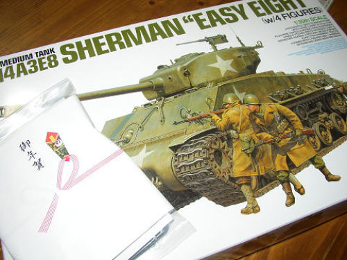 みなさまあけましておめでとうございます。今年もよろしくお願いします。★☆ タミヤM4A3E8イージーエイトの二つ目です。手に入るときにはポンポン手に入りますね。以前注文して品切れと言われていたのですが、(ネットで見つけて買った)映画「フューリー」の影響で再版を決めて入荷したものです。中身はアスカのものなので契約とかいろいろあっただろうけれど、頑張ってくれたんですね。模型店でも、私の注文であと三つ買ったんだけど「入った日にあっという間に売れた」とのこと。★☆お年賀としてタミヤの「将軍人形」を頂きました。