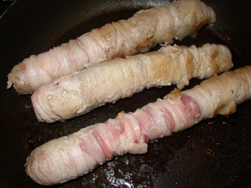 我が家では結構定番の料理「葱の肉巻き」まんまの料理です。いつもは牛肉を使いますが、今回は豚肉でやってみました。 醤油と砂糖のたれに絡めて切ったらこんな感じになります。