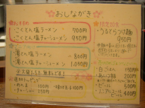 西大路花見小路を東に入ったところにあります。駐車場は手前に5台。メニューを見ると「俺のラーメン あっぱれや」と非常によく似ています。入口の処に店長とあっぱれやの店長との写真がかかっています。 塩系のラーメン中心で「こしょうオイル」 もそっくりです。 こくとん塩ラーメンのルックスはこんな感じです。半分の卵は追加トッピングしています。(切ってもらってシェアしています)麺も自家製平打ち麺。メンマの感じも似ています。これはもう支店と呼んでいいでしょう。正式のれん分け店なんでしょうね。味もお墨付き。 汁完してしまいます。満足の一杯です。市内の人はここで食べるのが食べやすいでしょうね。ランチ、夜営業もやっていますし。