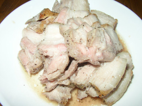 豚ばら肉に塩胡椒をして一時間置き、ローストをしました。オーブンでいつものように焼きますが、今回はアルミホイルで全体を包み、10分間寝かせました。この工程が良かったみたいで、肉に甘みが増し、全体が柔らかな焼き具合になりました。美味いです。