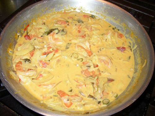 こちらはココナッツミルクを使った海老カレーです。どちらかと言うとインド料理と言うよりタイ料理のような感じです。 材料はこんな感じです。生姜が効いています。 出来上がりです。甘いです。
