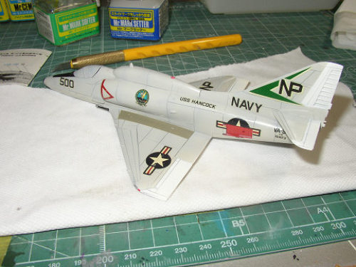 ここまで、デカールがすすみました。とは言うものの、何枚かがジグソーのように崩壊。リキッドフィルムわ使ったのにね。それでも、ピンセットで修復しました。このうち3枚は崩壊したのだけれど解らないでしょ。ルーペを使うと修復は何となくわかるけれど、私の肉眼では不可能です。