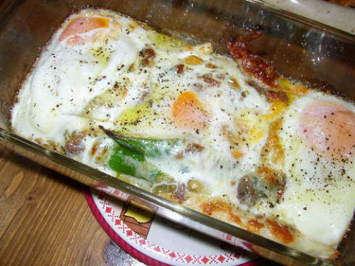 アスパラガスにオリーブオイルをかけて、生卵をのせます。塩胡椒をしてオーブンで焼くだけのシンプル料理。ジューシーで美味しいです。