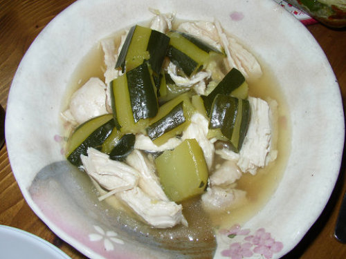 ズッキーニを茹でて胸肉とサラダ仕立てにしてみました。ダシは鰹だし。あっさりとした冷製のサラダです。こんなのもありですね。