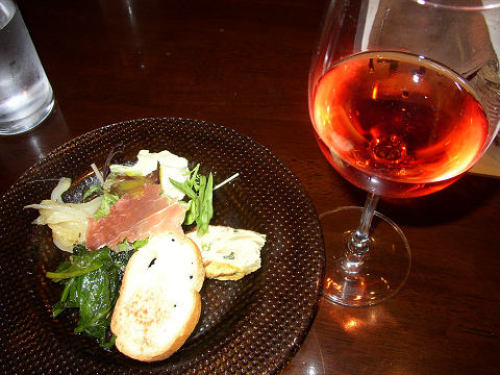 奈良のトラットリア ピアノアンティパストとワイン。 5種のチーズのピザ(チンクエフォルマッジ)。 ホタルイカと桜えびのピザ。