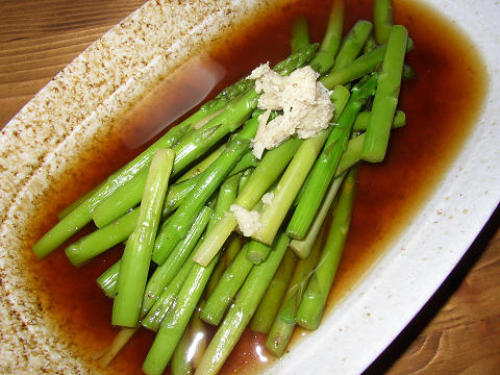 アスパラのサラダ。蕎麦だしに生姜で頂きました。この食べ方は美味しい。