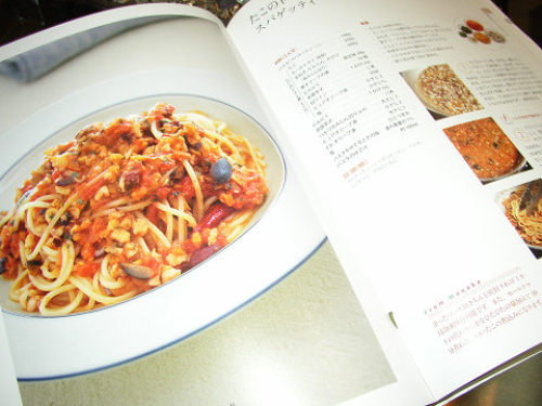 料理本を見ていて美味そうなパスタに目が留まりました。「たこのスパゲッティー」これこれ、今日はこれに決定。 材料はこんな感じです。手前のボールは蛸です。フードプロセッサーにかけて細かくしています。右が、セロリをフードプロセッサーにかけました。トマトソースにブラックオリーブ、ガーリックと言った感じです。 できました。 盛り付けはこちら。