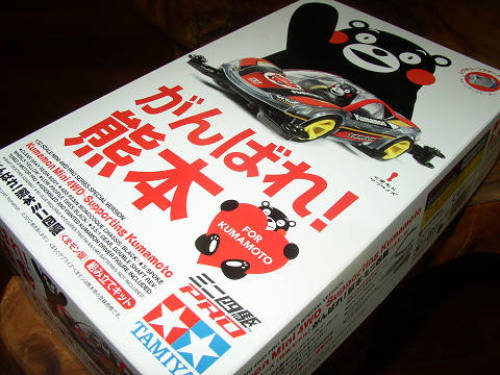 今日、到着しました。 タミヤ限定バージョンの「がんばれ熊本 ミニ四駆」 収益は全部熊本の復興支援にあてられるそうです。 ミニ四駆ファンもそうでない人も熊本支援の為に買いましょう。 レブチューンPROが入っているのも嬉しい。 中身はこんな感じ。クリアボディに両軸のレブチューンPRO。くまモンも入っています。これは以前のくまモンバージョンのフィギアですね。 これですね。 ミニ四駆特別企画商品 がんばれ!熊本 ミニ四駆 (くまモン版)[タミヤ]《発売済・在庫品》