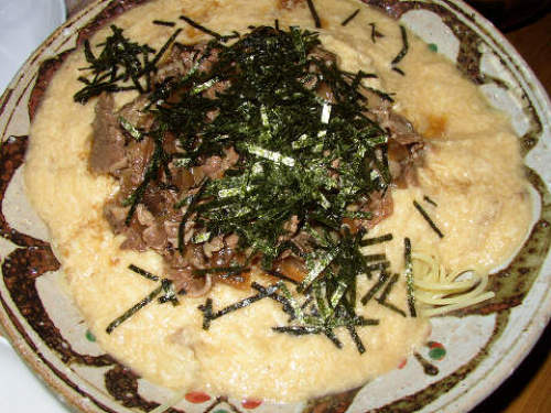 大和芋を出汁と生卵でのばし、一昨日作った牛丼の具をのせました。牛丼の具は味が染みて濃くなっています。それがちょうどいい塩加減。刻み海苔を載せていただきました。ちょっと食べ過ぎの感あり。(笑)