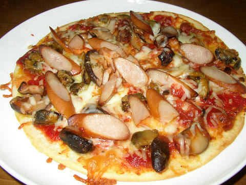 ソーセージのピザを作ったぞ。ピザシートがあれば瞬間でピザはできるよな。