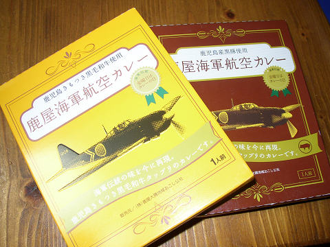 鹿屋海軍航空カレー、黒毛和牛使用と黒豚使用カレーの二種。横須賀海軍カレー味はともかくパッケージで惹かれて買いました。