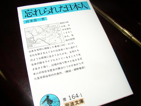宮本常一(みやもとつねいち) 『忘れられた日本人』 岩波文庫民俗学の本としては代表的一冊。関西に残る「記憶の歴史」を一枚一枚集めていった労作である。「記録の歴史」ではなく消えてしまうもの、目には見えないものを丁寧に集めるというフィールドワーク手法を確立した学者として柳田国男に並び称される。★☆このところ民俗学にはまっている。なかなか面白いね。時々夢で大学受験の時のことをみて、専攻を民俗学にしている自分がいる。下宿はとんでもない古い集合下宿で、どういうわけか私の部屋には隠し部屋のような書庫が3つある。その奥の階段を下りていくと別の出口があるというへんな部屋なのだ・・・3つの部屋一杯に詰められた書籍は壮観だが、卒業したらどうしようという現実的なことを考えている自分が夢ながら可笑しい。