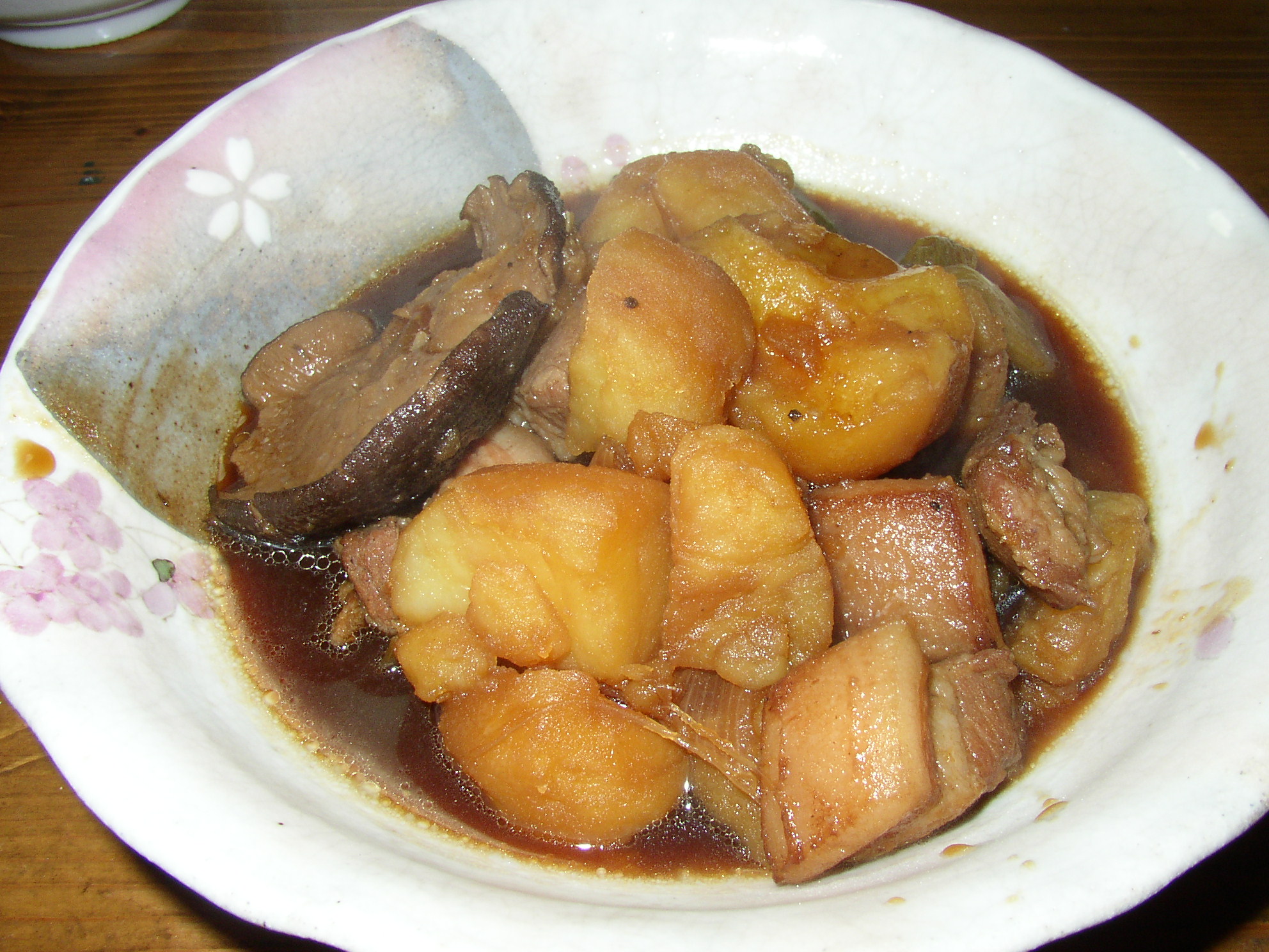 豚じゃが肉は三枚肉のブロックを角切りにして使っています。味は少し濃い目。ご飯に載せていただきます。じゃが芋もしっかり味がついてて美味しい。脂身が甘くてこれまたイケル。自画自賛だが(笑)