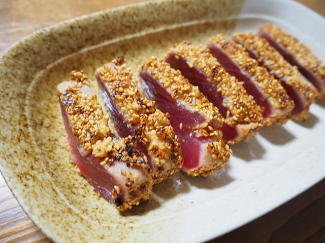 面白そうなレシピがあったので一度やってみました。キハダマグロの短冊に味噌を付けて炙ります。その後、胡麻を絡めて・・・・さてさて、出来上がりです。一口、バクッと・・・・う、普通の刺身の方が美味い orz