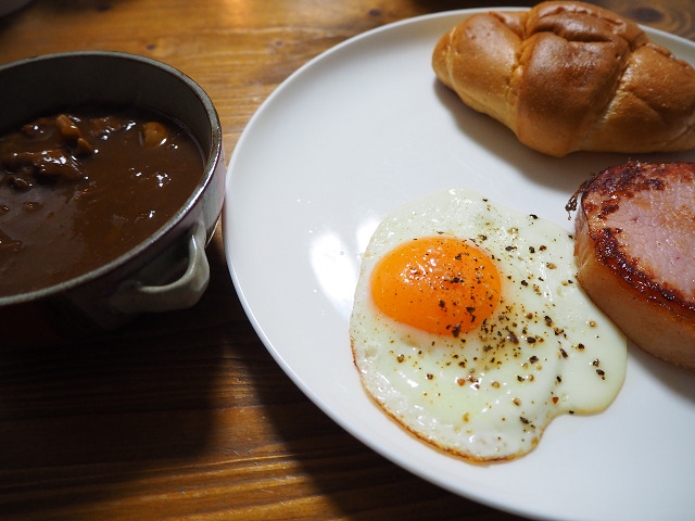 今日は久しぶりに「たまき亭」のパンで朝食です。これは私の中で一番人気のパンシュー。中にはゴロゴロしたベーコンとポテトが入っています。使っているのはエスカルゴバター。コクがあり美味しいです。町のパン屋とは思えませんなぁ。これが中身。ベーコンの大きさが半端ないです。調理パン。チーズとハム。これも美味しい。付け合わせとしてパンチェッタ(塩漬けの豚)を焼きました。ベーコンみたいでベーコンでないところが美味しいですよ。後は目玉焼きとコーヒーです。今日は土曜日。絶賛休息中です。