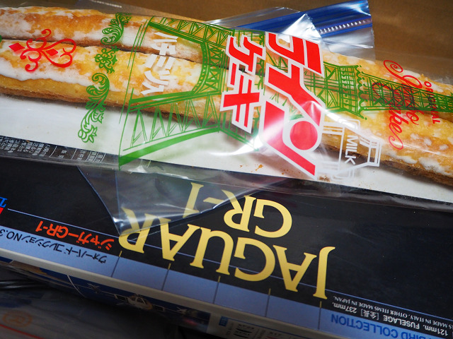 タミヤのジャガーの上に載っているのが愛知県名古屋市の製菓店、よしの屋製菓の「ラインケーキ」このパン(ケーキと言うよりパンと言った方が良いんだろう)は奈良のスーパーで買ってきたもの。境港で大好評の・・・と書いてあった覚えがあるのだが、名古屋製。「境港・ラインケーキ」で検索しても全然出てこないし(笑)ネットで検索したら、名古屋人が知らなかったととの書き込みも多いし(笑)タミヤの箱からも想像できるが、勇に30センチを超えてくるという大型のものです。しかも三本入り。(一本食べました)レジ横にあって思わず突っ込んでしまったという・・・レジ横と言うのは思考を崩してしまうような商品置いたらあかんよね。完全にそれにはまったわ。なんか、チェリオの自動販売機で得意になっていた小学校時代の自分を観るようで・・・砂糖の付いた揚げ菓子風のいかにも健康に悪そうな顔しているのが惹かれる。味はちょっとパサパサ感が否めないが、しっかりと昭和の味を出してくれている。懐かしい感じのパンでした。