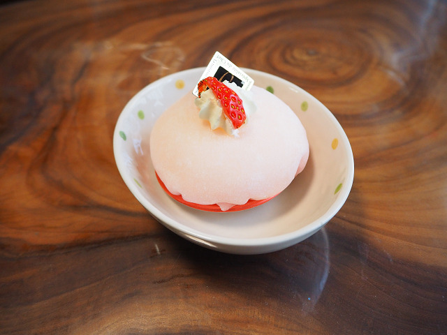 山田太郎です。人の名前ではなくてこのケーキの名前。奈良で買いました。最近、多いらしい餅で覆ったケーキです。下はカステラ生地になっていて、その上は生クリームとカスタードクリーム、イチゴ1個が入っています。美味しいです。ただし、一つ難点を言うと食べにくい。餅は柔らかくて粘りがあるので切りにくく、その上中はクリームなので柔らかい。切って食べるのは諦めて、持ってかぶりつきました。(笑)ちなみに山田太郎のネーミングの理由は使っているイチゴが山田農園のものだからだそうです。