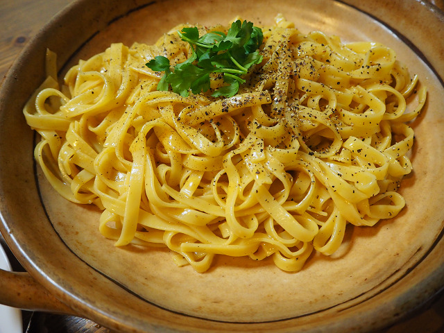 生のフィトチーネでカルボナーラを作ってみました。基本的には「ラ・ベットラ」の落合シェフのレシピの受け売りでございますが、そこまでできてもいません。生のフィトチーネがモチモチで美味しいです。この塩味は以前作っておいた塩漬けの豚(パンチェッタ)をダシに使っています。オリーブオイルでパンチェッタを炒めて、出た塩味を使っているのです。凝っているでしょ。パンチェッタは炒めたらもちろん取り除きます。取り除いたのがこちらね。実はこれが美味いの。カリカリして塩味が効いて。これは次のポテトサラダの具にします。当然細かく砕いてね。取り分けたのがこちらだよ。つやつやして美味しそうでしょ。(笑)これがカルボナーラじゃ。参ったか(笑)ついでにこれも載せとこう。生ハムのサラダだよ。ルッコラ、トマト、キュウリ、ワインビネガーに漬けた赤玉ねぎだよ。キュウリはスライサーで憂く切って。トマトも極力薄く。自家製ドレッシングと檸檬果汁を搾っています。酢は極力使わない。(笑)酢は小さいころのトラウマ。悪くなったものを食べさせられたことがあり酢はそれ以来トラウマです。私が料理に五月蠅いのもそれが原因です。(笑)