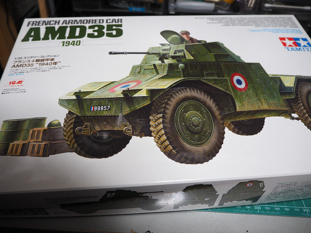 タミヤのAMD35、フランスの装甲車ですね。ICMのOME商品ですから純粋のタミヤ製ではありませんがなかなか良くできたキットです。内装やエンジンも再現されているので作り応えがありますがなんと言っても嬉しいのはその価格。2000円ちょいで手に入るのは嬉しいですね。最近、ホント海外のキットが高くなって、タミヤは良くできていのにリーズナブルです。タミヤのオマケとして、搭乗者とヘルメット、ドラム缶、弾薬ケースなどが付いています。1/35 ミリタリーコレクション フランス4輪装甲車 AMD35“1940年”プラモデル[タミヤ]《発売済・在庫品》1/35 フランス パナール AMD35(178)装甲車【35373】 ICM [H 35373 パナールAMD35]【返品種別B】1/35 フランス パナール AMD-35(178) 装甲車 w/装甲車兵【35381】 ICM [ICM 35381 パナール AMD 35]【返品種別B】ICMのフィギアは魅力的なので、このタイプはいいなぁ。ちょいと高めだけど。