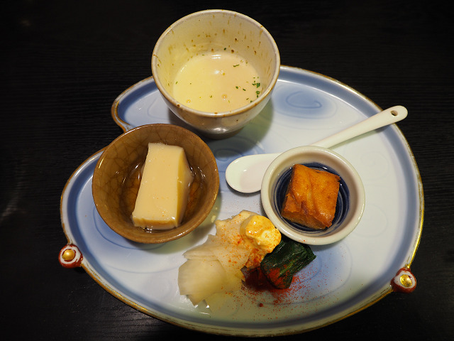 墓参りの帰りに宇治駅前商店街の中にある「roji」と言う新しいお店に行ってきました。初めての訪問です。ランチにも予約がいるということで「お刺身定食」と「豚肉の蒸籠蒸し定食」を予約していました。最初に出てくるのは「おばんざい」(京都でいうところの家庭料理のおかずと言う感じです)です。上から「ブロッコリーのスープ」「魚の揚げだし」「「豆腐と燻製チーズ」「千枚漬け」「ごま豆腐」ですね。そしてこちらが「豚肉の蒸籠蒸し」です。野菜と豚肉が蒸籠で蒸されています。そしてこちらが「お刺身定食」演出が凝っていますね。(笑)刺身もコリコリしていて美味しいですね。鱸・クロダイ・マルコです。マルコっていうのはハマチとブリの中間の大きさの魚ですね。それにクロダイの塩焼きが付ています。なんとも豪勢ですね。そして最後にコーヒーとデザート、ほうじ茶のゼリーと桜のアイスクリームはなかなかいい感じですね。蒸籠蒸しが1500円、刺身定食が1850円です。なかなかリーズナブルです。