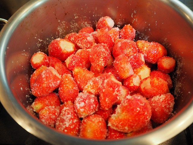 かおりのを使って今年二度目のジャム製作。少し砂糖を振って馴染ませます。大量のイチゴ。この季節の楽しみ。奈良はイチゴの産地だから美味いのだよ。京都市内ではどういうわけか九州産のイチゴが多いね。アスカルビー、古都華、章姫、かおりの、こちらはそのまま頂きます。