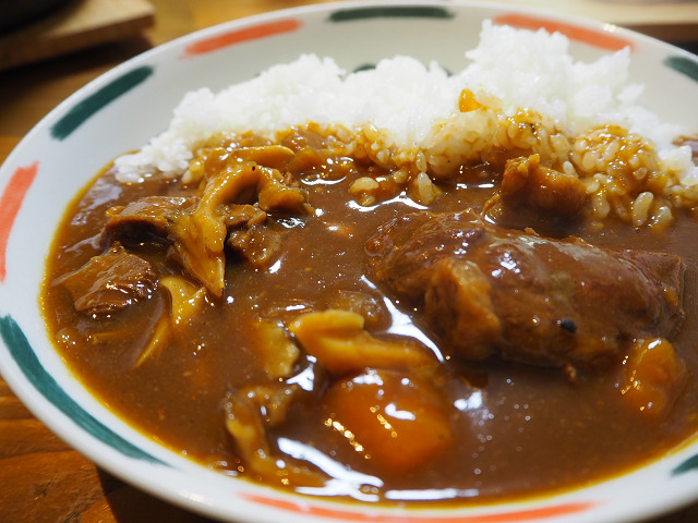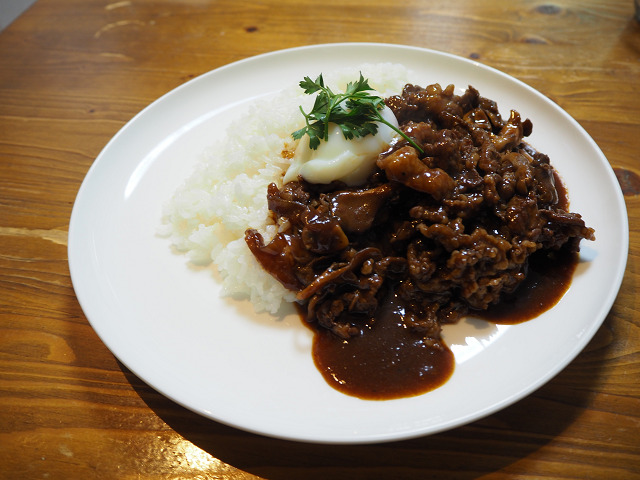 フォンドボーをしっかり突っ込んで、ハッシュドビーフを作りました。サワークリームなんか付けて見た目をよくすればいいのだろうけれど、ここはパス。私の好みです。その代わりと言っては何なんですが、小麦粉を振った牛肉をしっかり焼いています。こうすると香ばしくなるからね。温泉卵(自家製)を足して・・・うまいなぁ。インカの目覚めも付けときましょ。