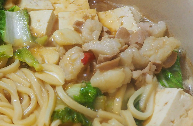 寒いのでもつ鍋にしてみました。初めからうどんを入れるタイプです。とっても暖まりますよ。