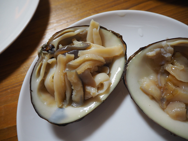 北寄貝の大きなのが2個手に入ったので刺身にしました。貝の刺身は栄螺が多いのですが、今回は北寄貝です。季節ですからね。身とひもに分けて処理しています。刺身作った手は礒の香りがしています。貝の刺身はうめーぞ。