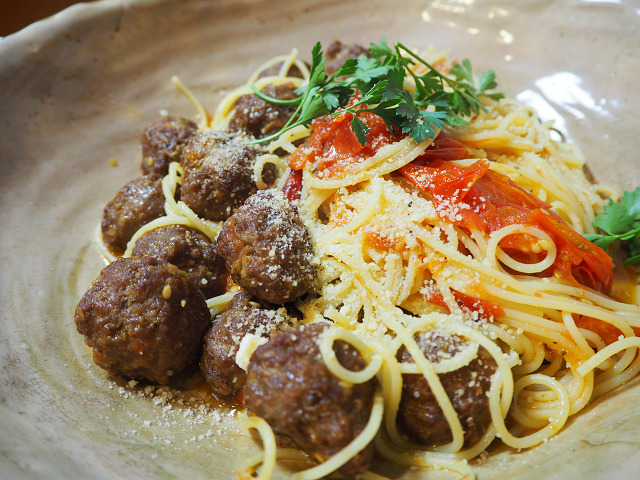 ミートボールパスタです。ミートボールはミンチをこねて一度揚げています。手間がかかるのですが、味わいが全然変わりますので、ここは手が抜けません。カリオストロの城で見て以来、このパスタにははまっています。盛り付けるとこんな感じ。カリオストロではもっとケチャップケチャップしていましたが、ナポリタン風ではなくて、フレッシュトマトのソースを作っています。そしてもう一つはポルチーニ茸のクリームソースパスタです。これはポルチーニ茸を戻した水もソースに投入することで風味を上げています。これはいつ喰っても美味い。グリーンサラダも付けましたわ。以上本日の夕食。パスタ率多いでしょ。簡単だし(笑)