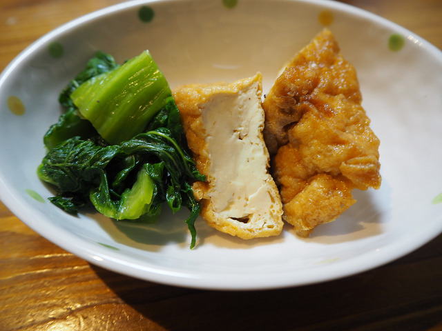 今日の夕食は地味だよ。厚揚げとかつお菜の煮物。きな粉豚と新玉ネギの炒め物。手作りワンタンのスープ。おとなしい夕食です。