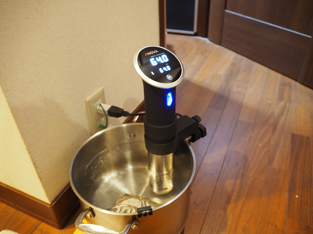 家に帰ったらすぐに低温調理器にチキンを投入しました。67度90分です。(玄関先で作っています)今日はシンガポール料理を作ります。さて、出来上がったチキンがこちらです。メチャクチャ柔らかくてジューシーです。本来、シンガポールでは蒸し鶏を使います。が、ここは神なる調理器アノーバちゃんに登場していただいた次第です。そして付け合わせの野菜です。盛り合わせて海老をたっぷり入れたマヨネーズソースをかけます。うっしゃ、ええ感じです。そこにバスマティーライスを土鍋で炊いたジャスミンライスを添えて、上からチキンを置いて完成です。ハイナンジーファン(海南鶏飯)、タイでは、カオマンガイと呼ばれています。まぁ、本チャンではなくてアレンジしていますが。メチャクチャ美味しかったので良しとします。(笑)