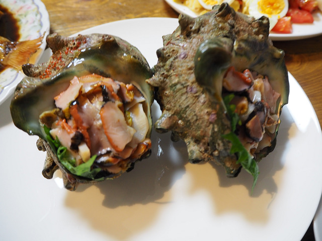 かなやんの栄螺の刺身。一応、刺身として作ってあります。大きさは大人の握りこぶしよりも巨大です。初めて見たわ。生きた状態で分けてくれた方が良いのだけれど、貝の刺身は一般主婦には難しいらしい。仕方ないね。どこの世界も基本的にレベルの低いものに合わせざる得ないのか・・・それがもしかして民主主義と言う幻想?