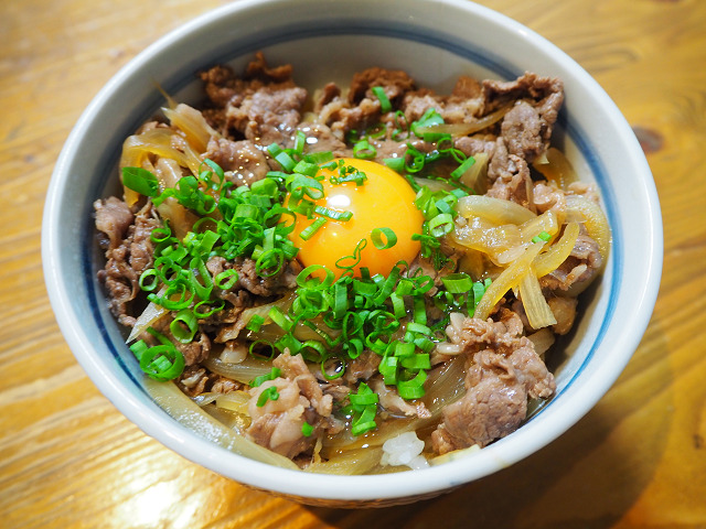 牛丼作りました。安い牛肉だったので少し硬いかな。噛めば噛むほど味が出てくるが・・・(笑)