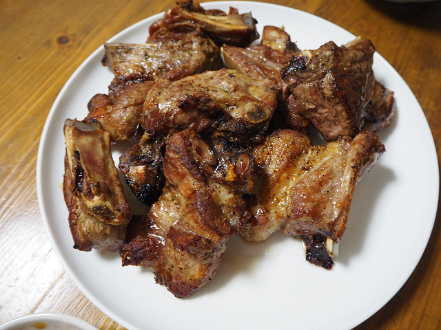 暑さに負けないようにしっかり肉を食べましょう。スペアリブを焼いてみました。国産の黒豚のスペアリブです。こんなの見かけたらついつい買っておきたくなりますわ。塩味であっさりと味付けです。付け合わせにポテトサラダ。こちらも味付けはあっさり目。マヨネーズは控えめです。一人分として盛り付けてみました。これだけでお腹いっぱいになりそうなくらいの大きなスペアリブです。そして、夏の定番玉蜀黍ご飯。甘くて美味しいよ。コーングリッツ(芯の部分)も一緒に炊き込みます。味が出るんだなぁ。