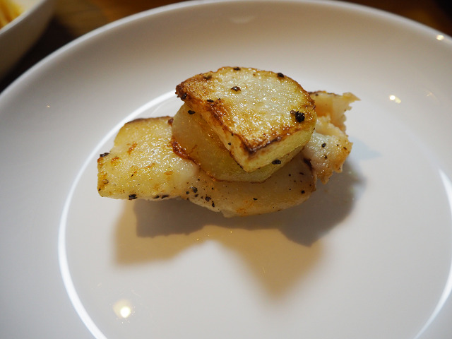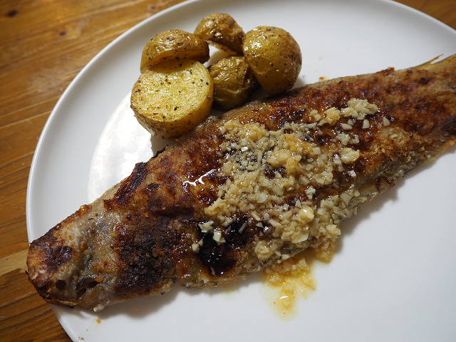 鮃と大根、ジャガイモのポアレ。大した材料ではないですが、何となくリッチ。ほうれん草と人参のソースを作って手前に線状に流すとレストランみたいだね。今度はそうします。料理は面白い。