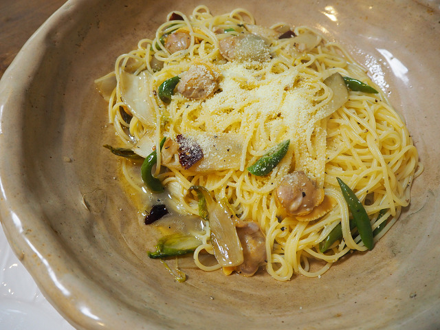 ホンビノス貝が安く入ったのでこれを基本にペペロンチーノを作りました。ホンビノス貝をそのままパスタに入れると殻がやたらに嵩張って食べにくいと思い、一度ワインで蒸しています。そのスープはペペロンチーノのソースに使ってます。ホンビノス貝は浅利なんかに比べると、まぁ根性があってなかなか口を開きません。内閣調査室並みでございます。仕上げにパルミジャーノチーズを削って振りかけています。同じところで白えびも安く買えたので、これは刺身で食べます。ちょっと醤油を付けて、中の身を吸い出して食べます。富山の「白えび亭」なんかだと、上手く絞り出すのですがとてもそんな芸当は出来ません。スイートポテトと豚肉の炒め物です。甘いポテトがしょっぱい味によく合います。