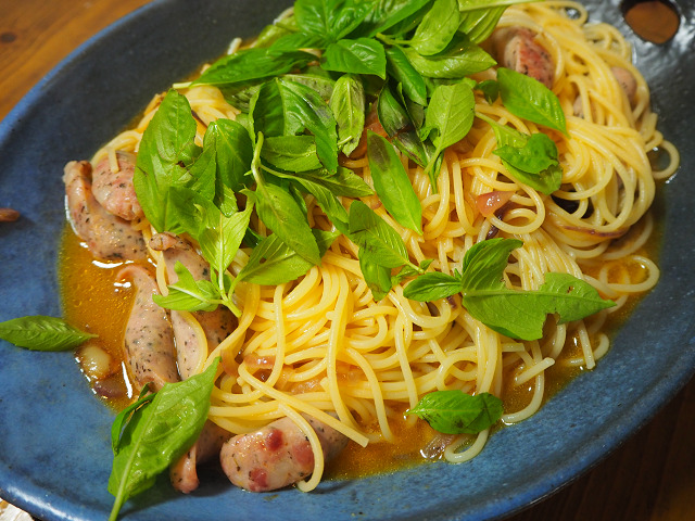 庭のバジルと頂き物のソーセージ。バジルはバッタくんにかなりやられています。ミートローフ。いちいち一個ずつ作ってられないから、一気にオーブンで。美味しいですよ。シンプル・イズ・ベスト