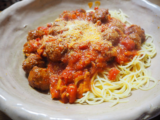 我が家定番のミートボールパスタ。時間はかかりますが絶品です。ミートボールは一度油で揚げてあります。この点が美味しさの秘密です。盛り付けて、パルメジャンチーズを削りました。
