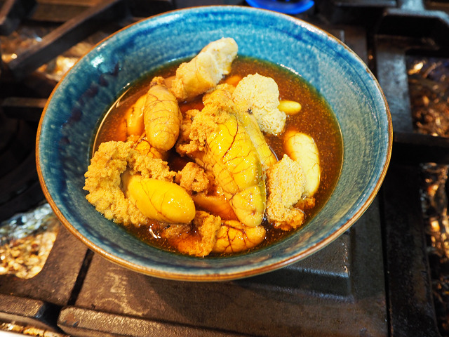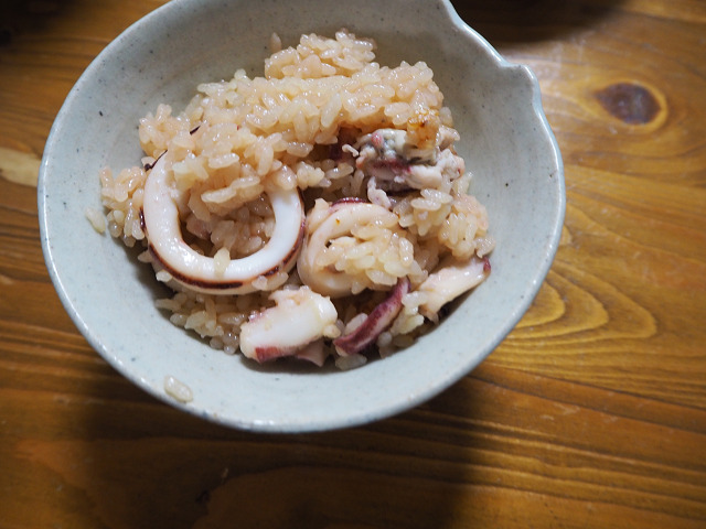 鯖の塩焼きですが、今回使った鯖は現地で〆作業が行われている生鯖を使いました。網でガサッと収穫して冷凍庫にぶち込まれたものでなく、一本釣りされたものをその場で活〆したものです。こんな鯖が日本の内陸部で手に入るよなぁ。凄いです。朝市ヽ(^o^)丿。茄子と干しエビの煮つけです。一度揚げた茄子を国産干しエビの出汁がしっかり出ているもので煮つけています。美味さが違います。そして本マグロの赤身。歯ごたえがあるほど身がしっかりしています。で、最後にスルメイカのご飯。ワタも入れて炊いていますので烏賊感が半端ないです。土鍋で炊いていますので、おこげも美味しい。魚屋朝市仕込みのご飯でした。これで、3人分2000円。