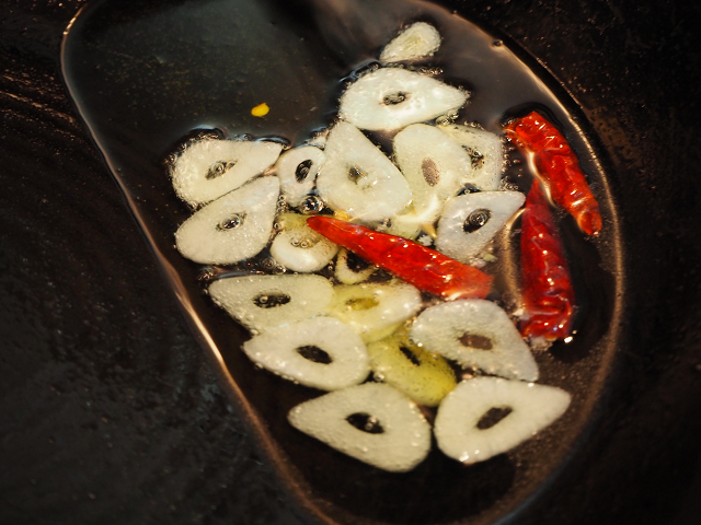 たっぷりのオリーブオイル、低温でガーリックスライスを揚げていきます。ガーリックフライを作っているだけじゃなくて、オイルに香りを移しています。今回作ったのは千葉県産の蛤と、北海道産の水ダコを使ったペペロンチーノです。水ダコは刺身にして残った皮や吸盤を主に使っています。盛り付けるとこんな感じです。これが水ダコの刺身。本体は生のままですが、皮と吸盤は塩ゆでして食感の違いを味わいます。鮟鱇のから揚げも付けてみました。なんとまあ多国籍料理であることか。
