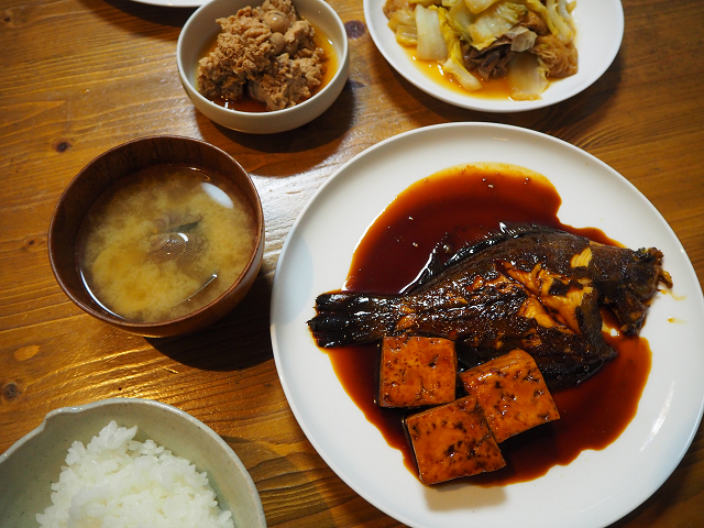 鰈を煮付けてみました。最近、魚率が高いね。大振りの浅蜊の味噌汁。白菜の煮物もね。