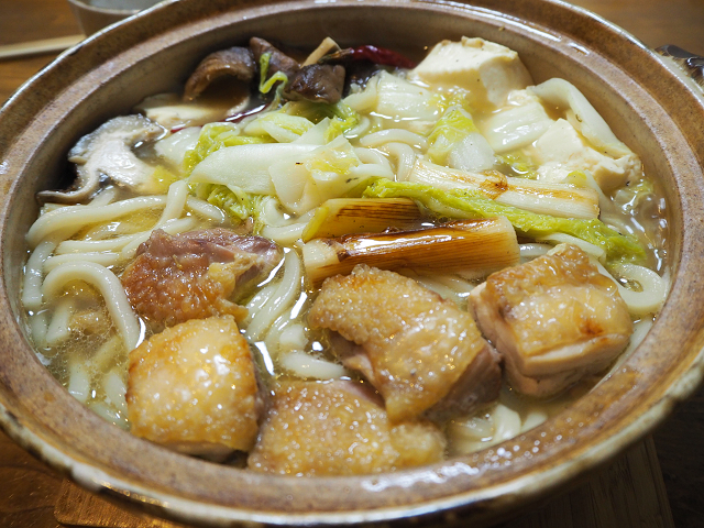 鶏鍋作りました。鶏鍋のスープは鶏ガラ・モミジでダシをとっています。くわえる鶏はフライパンで表面を焼いています。葱は網で焼いてね。少し醤油で味を付けて。初めからうどんを投入しています。我が家の鶏鍋です。