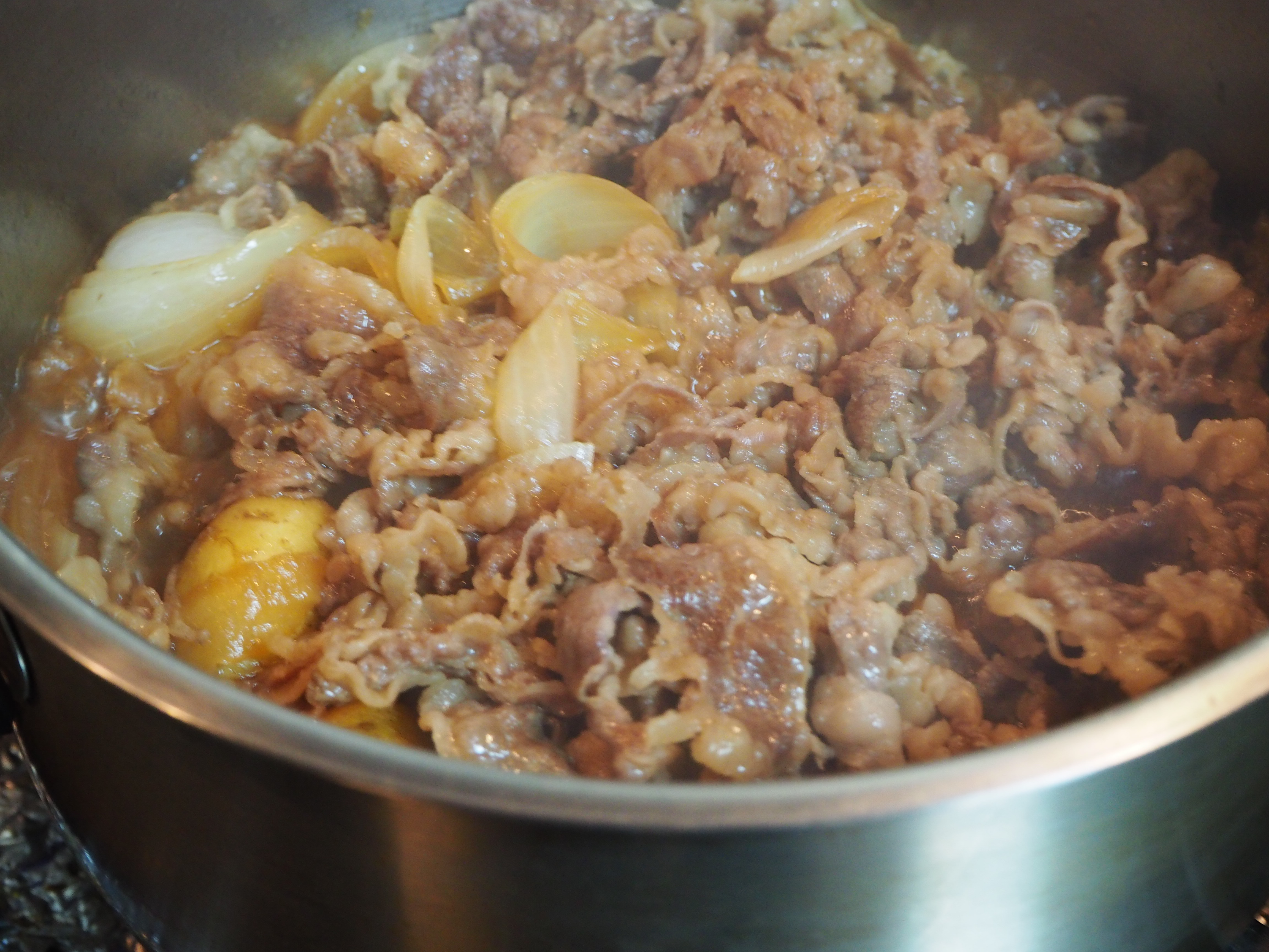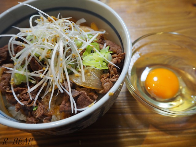 牛丼作りました。肉は近江牛、玉ねぎは淡路産、ねぎは九条ネギ(白髪ねぎは違うよ)。卵は限定の桜卵だよ。牛丼も気合入れて作ってみました。