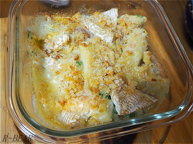 先日作って余ったパスタのクリーム煮を再利用料理をしました。キャセロールに入れて、上からカマンベールチーズをのせてオーブンに投入。これって先日のモノより美味いかも。前の形がこれですね。茄子の揚げ付けとチキンの天ぷらの揚げ付け。美味しいです。
