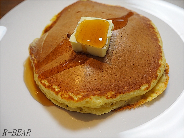 休日の朝はホットケーキです。それとカリカリベーコン。