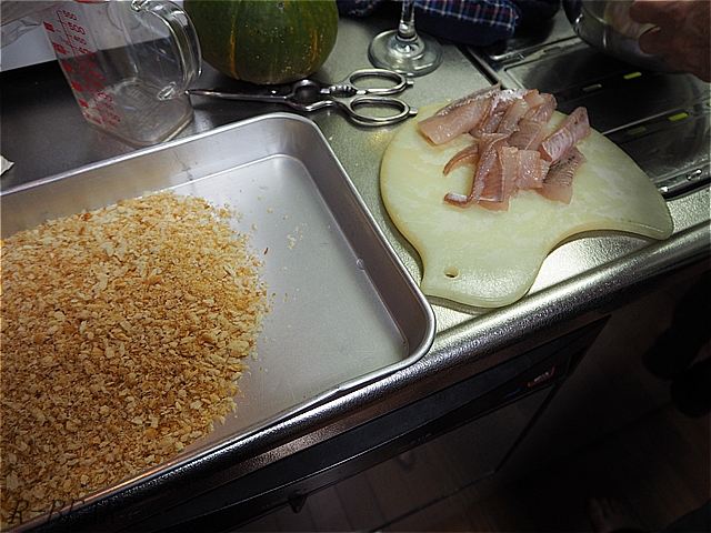 生ホッケ、岩牡蠣、ミル貝。生ホッケはフライにします。後は生かな。三枚におろします。血合い骨を切り取ります。これで、フライの材料は出来上がり。後は普通にフライにするよ。